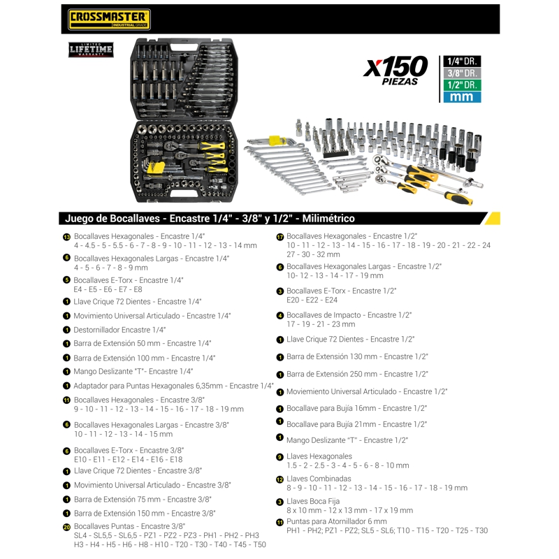 Juego De Bocallaves 150 Piezas – Encastre 1/4″ – 1/2″ – 3/8″ Con Maletín